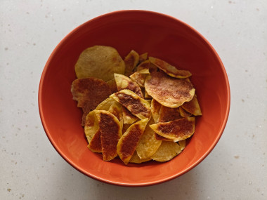 Захотелось чипсов. Решила приготовить чипсы в микроволновке за 5 минут. Картофель у меня был молодой. Из специй использовала соль, черный молотый перец, сушеный базилик и сладкую паприку. Картошку очистила, тонко нарезала овощечисткой, смазала смесью из специй и масла. Выложила на салфетку и отправила в микроволновку при максимальной мощности на 2 минуты. Чипсы не переворачивала, так как за 2 минуты они полностью приготовились. Вкусные, хрустящие чипсы получились. Спасибо за рецепт.