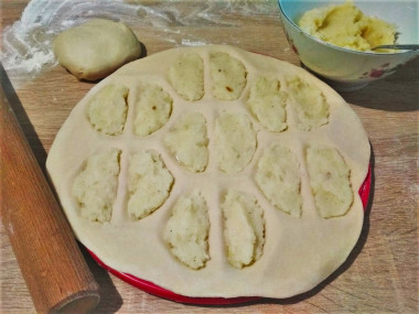 Разомните картофель в пюре, добавляя оставленный отвар. Добавьте поджаренный лук вместе с маслом, на котором он жарился. Перемешайте. Оставьте начинку остывать.