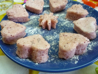 Рабочую поверхность присыпаем ровным слоем сахарной пудры выкладываем на него облака и с помощью формочек или острым ножом нарезаем на порционные кусочки. Каждый кусочек обваливаем в сахарной пудре (не обязательно).