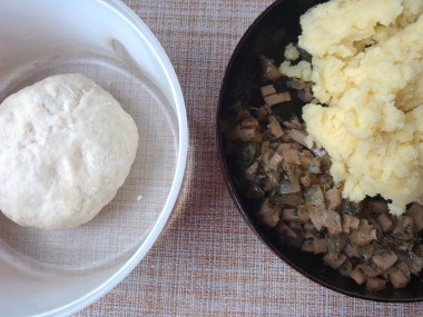 Для начинки отварила картофель, спюрировала его и обжарила лук с замороженными вешенками. Во время обжарки грибов добавила сухую зелень. Соединила картофель и грибы. Хорошо перемешала.