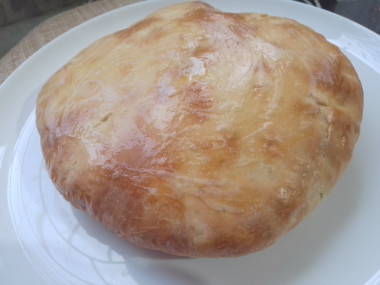 Я готовила простой закрытый пирог. Раскатала из теста лепешку с более тонкими краями. Выложила в центр начинку и скрепила края будущего пирога. Перевернула его выложив на застеленный пертнаментом противень и раскатала аккуратно скалкой. Смазала сверху молоком и поставила в печь.
