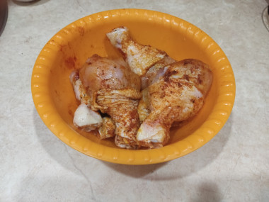 Куриные голени сложите в просторную чашу. Посыпьте их солью и специями. Полейте немного растительного масла. Перемешайте их руками, тщательно втирая специи в мясо. Оставьте голени в таком виде на 15-20 минут, чтобы они немного промариновались.