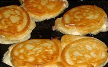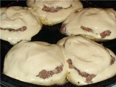 Аккуратно вылейте на фарш немного теста так, чтобы оно полностью покрыло мясо и опустилось по бокам от него на дно сковороды. Жарьте беляши под крышкой, пока тесто снизу не зарумянится. О том, как подобрать идеальную сковороду, а также как правильно выбрать масло, читайте в отдельных статьях, ссылки в конце рецепта.