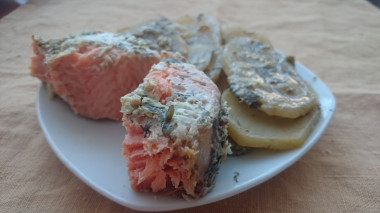 На картофель необходимо выложить кусочки форели. Форель предварительно необходимо немного посолить.