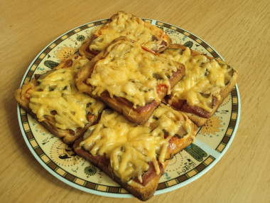 Запекайте бутерброды 10 минут, до расплавления сыра. Готовые бутерброды выньте из духовки, немного охладите и подавайте на стол. Точное время и температуру запекания определяйте по своей духовке. Приятного аппетита!