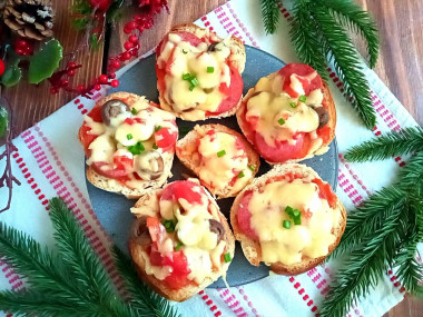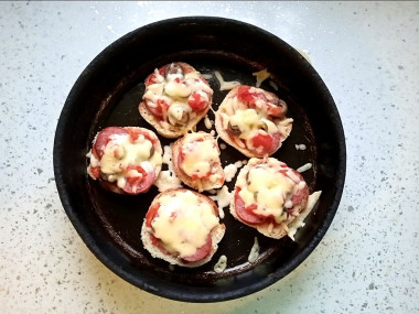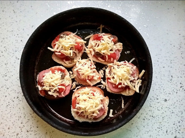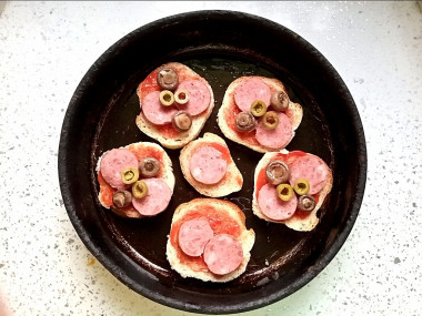 Ломтики батона выложила в форму, смазанную растительным маслом. В итоге мои бутерброды снизу слегка поджарились. Кетчупа я бы даже больше положила, чтобы посочнее было. Но это на мой вкус. Сверху выложила полукопченую полбасу. На некоторые бутерброды добавила маленькие маринованные грибочки и оливки. В общем то, что нашла в холодильнике). Помидор у меня был не сочный, поэтому нарезала его кубиками. Сверху присылала все сыром, который хорошо плавится. Через 10 минут запекания у нас была тарелка вкусных, ароматных горячих бутербродов! Отличный быстрый перекус!