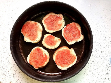 Возьмите ломтики батона, намажьте каждый небольшим количеством кетчупа (майонеза, горчицы). Слой делайте совсем небольшой, чтобы не размок мякиш хлеба.