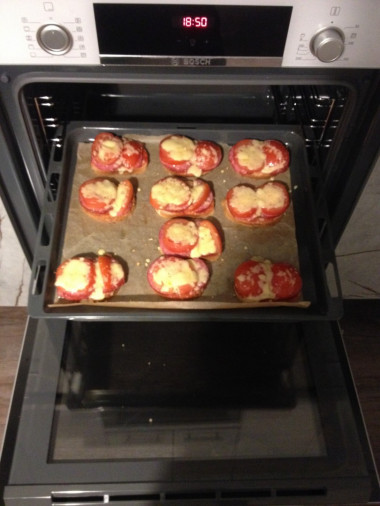 Сверху разложите ломтики помидоров. У меня получилось из расчета два ломтика на один бутерброд.