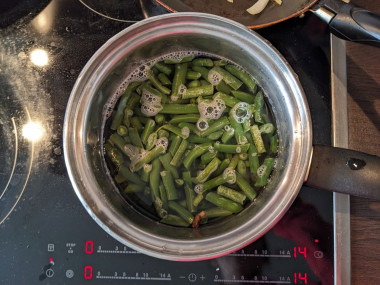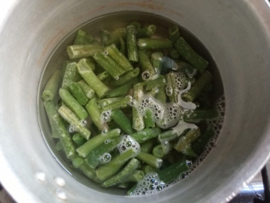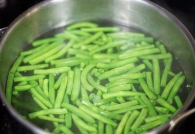 Зеленую фасоль отварите до готовности в большом количестве кипящей подсоленной воды. Если фасоль свежая, то хватит 5 минут, если замороженная, то 10 минут. Главное не переварить стручки: они должны сохранять упругость и яркий зеленый цвет.