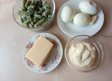 Как сделать салат с зеленой стручковой фасолью и яйцом? Подготовьте все необходимые ингредиенты. Яйца берите крупные, отборные. Желательно с ярким желтым желтом — так салат получится красивее. Стручковую фасоль можете использовать свежую или замороженную. Я использовала фасоль, замороженную целыми стручками, не резанную. Сыр берите своих любимых сортов, главное, чтобы он был качественным и вкусным.