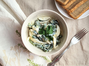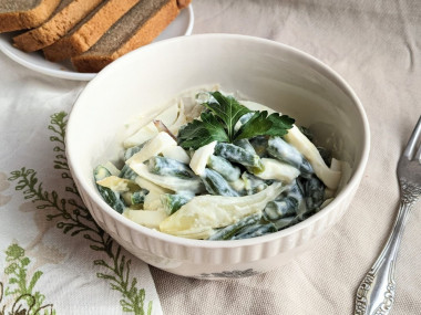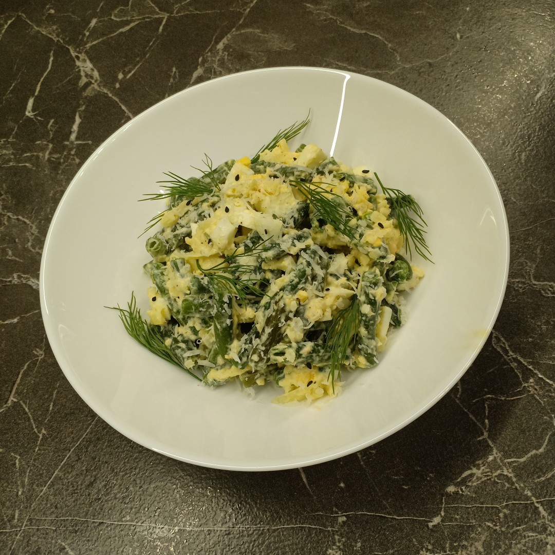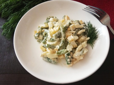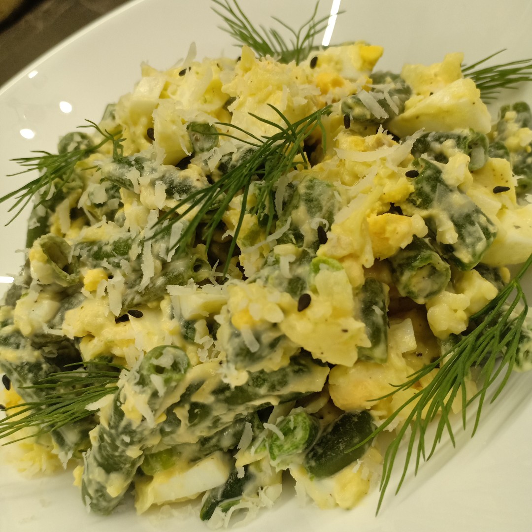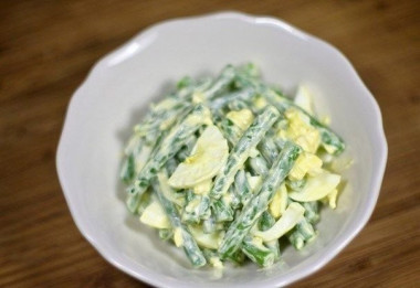 Приготовила салат с зелёной стручковой фасолью и яйцом. Фасоль у меня замороженная, отваривала ее в течение 5-7 минут. Остывшую фасоль соединила с нарезанными отварными яйцами, чесноком ( я взяла один крупный зубчик), нарезанным сыром. Заправила майонезом, немного присолила. Очень вкусный салат, сытный, пикантный. Спасибо за рецепт, Мария!
