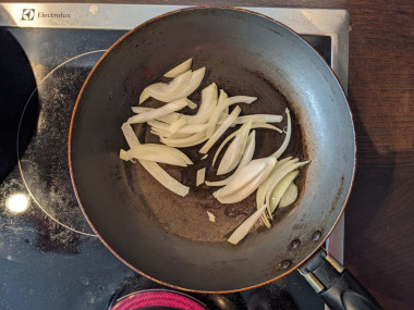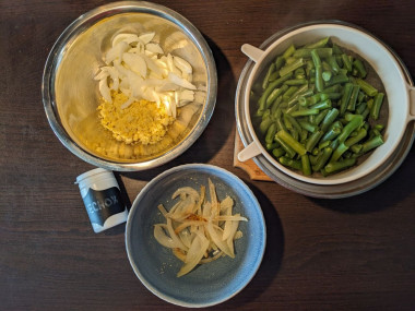 Отварила фасоль 3-5 мин, пожарила лучок полукольцами, отварное яйцо порезала полукольцами (желток отдельно покрошила вилкой)