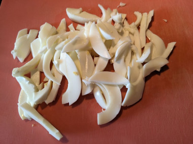 Яйца отварите вкрутую, охладите и очистите. Яйца крупно порубите ножом. Если вам нужна более мягкая структура салата, то яйца можно порубить мелко или вовсе натереть на крупной терке. Мне нужны были более ощутимые кусочки, поэтому яйца порезала крупно. Вы можете выбирать тот вид нарезки, какой вам больше по вкусу.