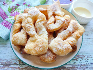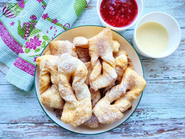 Готовый мягкий хворост подавайте в горячем или холодном виде, со сметаной, сгущенкой или вареньем, можете посыпать сахарной пудрой. Приятного чаепития!