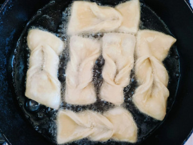 Хорошо разогрейте сковороду с растительным маслом и выложите обжариваться на среднем огне заготовки из теста. А все тонкости выбора масла для жарки и сковороды - по ссылкам ниже.