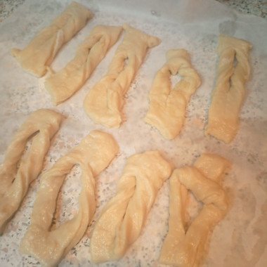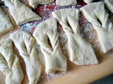 Выньте один конец теста через засечку прямоугольника, получится форма будущего хвороста.