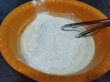 Муку просейте и частями введите в тесто. Если готовите такие оладьи первый раз, то не кидайте сразу всю муку, чтобы вовремя откорректировать консистенцию теста. Точное количество муки зависит от влажности и жирности выбранной простокваши, от размера яйца, от качества самой муки.