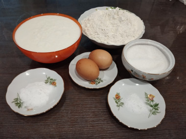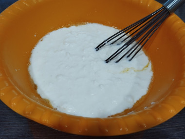 Масса должна получиться вязкой, но текучей и однородной. Если тесто получается слишком жидковатым, добавьте еще муки, если наоборот вязким и не текучим, то влейте еще немного простокваши.