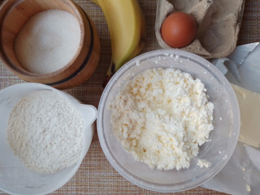 Тем временем приготовьте начинку. Бананы лучше взять спелые, сладкие, чтобы пирог получился более ароматным и вкусным. Творог подойдет любой жирности, мягкий. Чем мягче творог, тем нежнее будет начинка.