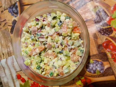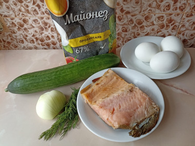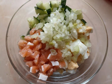 Пока яйца варятся, займитесь нарезкой всех ингредиентов. Рыбу очистите от косточек (если они есть) и нарежьте средним кубиком. Рыбу выбирайте малосольную, она нежнее на вкус. Хорошо подойдет рыба, засоленная дома. Вид рыбы может быть любой, но вкуснее будет с более жирными сортами — семга, форель, кижуч.