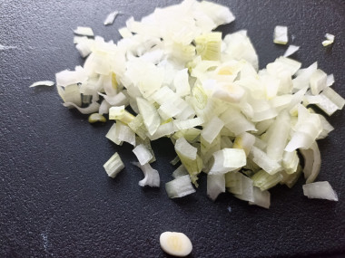 Половинку луковицы нарежьте мелким кубиком. Так как у меня сладкий сорт лука, я просто нарезала его. Если же взяли обычный репчатый, то ошпарьте его кипятком, чтобы избавиться от горечи.