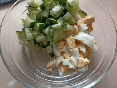 Огурцы, если нужно, очистите от кожицы и также нарежьте средним кубиком. Кожицу, если она не грубая, не повреждена и не горькая, срезать не нужно. Обязательно попробуйте его перед нарезкой, если огурец горчит, то возьмите другой, иначе салат будет испорчен.