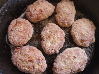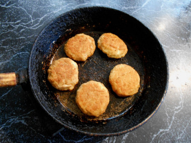 В сковороде разогрейте растительное масло, выложите котлетки и жарьте на среднем огне до появления румяной корочки примерно 5-7 минут. Затем котлеты переверните на другую сторону и жарьте до румяной корочки.