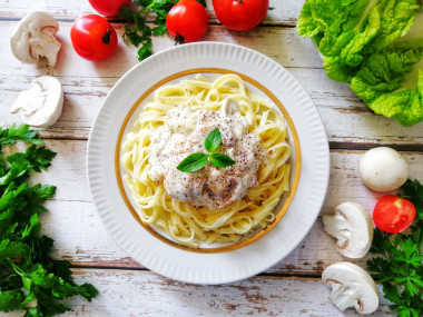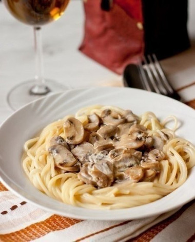 Спагетти в сливочном соусе будут вкусными даже без грибов.