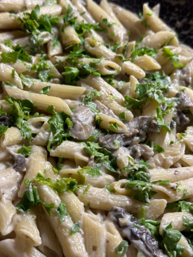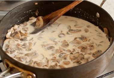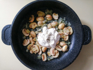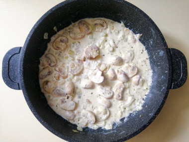 Сливочный соус сделала на основе сметаны, добавив ее к обжаренным с луком и чесноком грибам, влила ещё немного воды - одну пятую часть стакана.