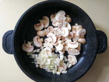 После чеснока выложите в сковороду нарезанный лук и грибы и обжаривайте все вместе 3-4 минуты.