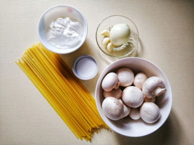 Как сделать спагетти с грибами шампиньонами в сливочном соусе? Подготовьте для этого необходимые ингредиенты. Сливки можно использовать любой жирности. Чем выше жирность сливок, тем более сливочный вкус будет у готового блюда. Как выбрать макаронные изделия вы узнаете прочитав статью в конце рецепта.
