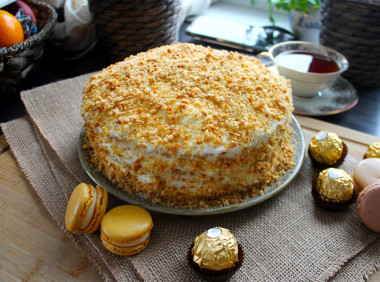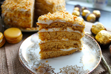 Смазываем наши коржи и бока торта получившимся кремом. Сверху присыпаем оставшейся от коржей крошечкой. Ставим пропитываться тортик в холодильник на 4 часа.