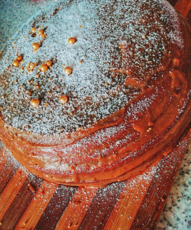 После приготовления, корж необходимо будет остудить. Остывший бисквит разрезаем на 5-6 коржей. Коржи смазываем нашим кремом, промазываем так же бока и самый верхний коржик. Отправляем тортик в холодильник на 20 минут.