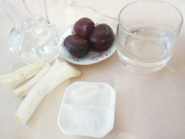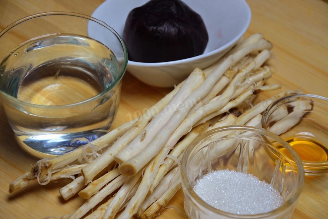 Подготовьте необходимые продукты. Возьмите корень хрена, вареную свеклу, воду, соль, сахар и уксус. Обязательно используйте перчатки и обеспечьте проветривание помещения для защиты от слезотечения.