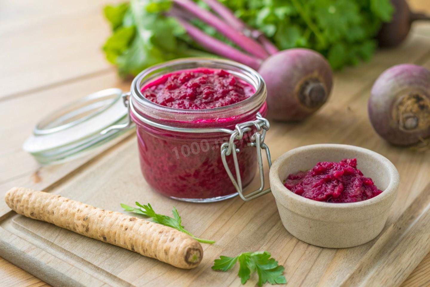Хрен со свеклой подавайте как острую приправу к холодцу, отварному мясу, языку, колбасам или пельменям. Отлично сочетается с картофелем и блинами с мясной начинкой. Можно использовать как основу для других соусов.