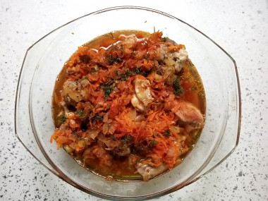 Перед обжаркой кусочки мяса обсушила полотенцем, чтобы было меньше брызг от контакта с горячим маслом. Обжаренного кролика сложила в стеклянную форму, сверху зажарку из лука и моркови. Посолила, добавила паприку, смесь перцев, сушеный укроп и залила все это пивом. Пиво у меня было темное фильтрованное. Запекалось блюдо под крышкой 1,5 часа.