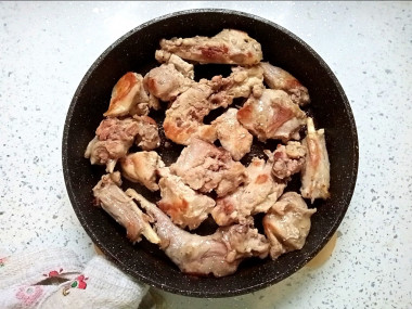 Разогрейте в сковороде растительное (или сливочное) масло и обжарьте кусочки кролика на сильном огне до золотистой корочки. Все мясо не старайтесь уместить сразу на сковороду, жарьте в несколько приемов, что бы мясо не начало тушится. Обжаренное мясо выкладывайте на тарелку.