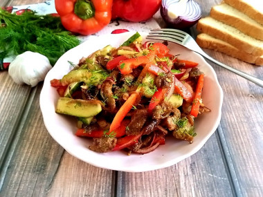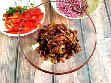 Ради этого блюда стоило потратить немного времени у плиты! Шикарный салат! Жареное мясо так хорошо сочетается с сочными овощами и сладко-острым луком. Болгарский перец тоже дает свою сладость. А заправка насыщает все это богатым вкусом и аппетитным ароматом.