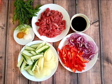 Увидела на сайте похожий рецепт с видео. Тоже говядина, огурцы, болгарский перец и соевый соус. Нужно будет попробовать.
