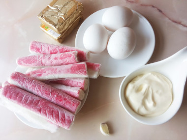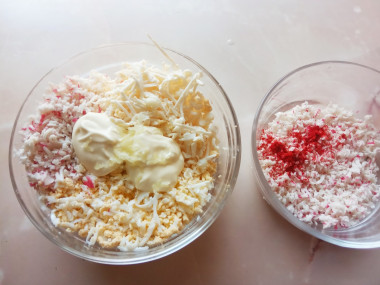 В миске соедините тертые крабовые палочки, плавленый сырок и яйца. Добавьте пропущенный через пресс зубчик чеснока и майонез.