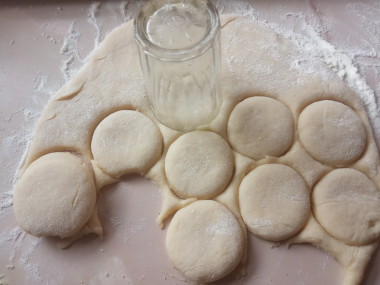 Теперь получившееся пряничное тесто нужно раскатать. Рабочую поверхность присыпьте мукой (в этом шаге ее понадобится еще дополнительное количество. Нужно добавлять ее столько, чтобы с тестом можно было работать). Само тесто обваляйте немного в муке, чтобы не прилипало к скалке и немного раскатайте. Его толщина должна стать 1 см, максимум 1,5 см. С помощью стакана или специальной формы вырежьте из теста кружки.