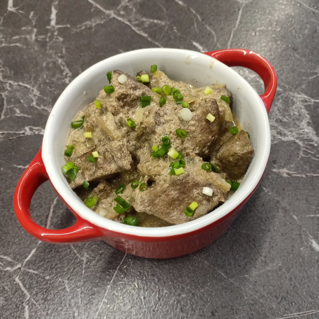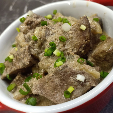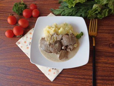 Разложите тушеную печень в сливках по тарелкам и подайте к столу с любым гарниром. Приятного аппетита!