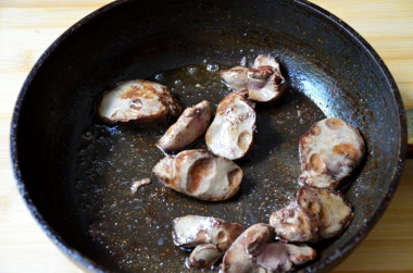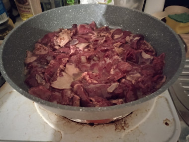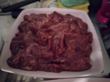 Печень тщательно промойте, пока вода не станет чистой, удалите жировые прослойки, остатки желчи. Крупную печень можете разрезать пополам.