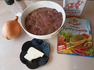 Калорийность продуктов: Куриная печень, Сливки, Лук, Сливочное масло, Хмели-сунели, Перец черный молотый, Соль
