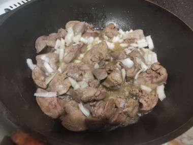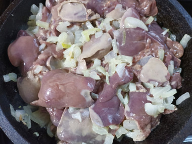 Добавьте в сковороду куриную печенку и перемешайте с луком.