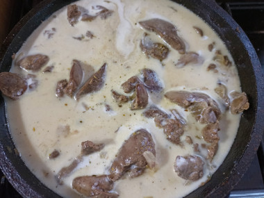Влейте сливки. Всыпьте соль и специи. Все перемешайте. Доведите до кипения и тушите, помешивая, еще 2 минуты. Можете также посыпать печенку смесью приправ для блюд из субпродуктов.