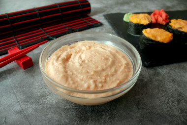 Перемешайте окончательно все ингредиенты. Соус должен получиться очень однородной, шелковистой консистенции, нежного светло-лососевого цвета. Соус готов к употреблению. Если вы хотите запечь с ним роллы или суши, то положите сверху на них по ложечке соуса и запекайте 5-10 минут. Приятного аппетита!