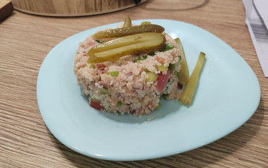 С тунца сливаем масло (по желанию масло можете оставить и им же заправить салат). При помощи вилки разминаем рыбу и добавляем к овощам.