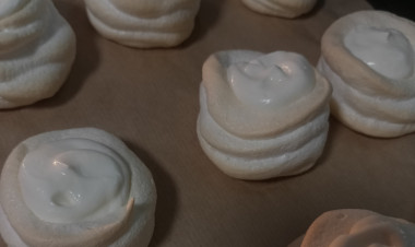 Поставьте меренгу в предварительно разогретую до 130° С духовку на 10 минут. Затем уменьшите температуру до 90°С и подсушивайте еще 30-40 минут. Точное время зависит от вашей духовки. Когда изделия станут светло-желтого оттенка проверьте их. Сверху они должны быть сухими, а снизу немного влажными и липкими. Оставьте корзинки на 10 минут в приоткрытой выключенной духовке. Затем аккуратно переложите на блюдо.