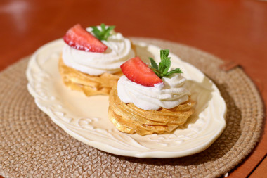 Так как я давно не делала меренгу, то решила приготовить этот десерт. Хозяюшка На удивление он у меня получился. Белки я взбивала при комнатной температуре около 10 минут. Блинчики